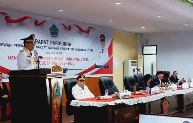 MINUT KOMENTAR-Dewan Perwakilan Rakyat Daerah (DPRD) Kabupaten Minahasa Utara (Minut) menggelar Rapat Paripurna dalam rangka mendengarkan pidato perdana Bupati Minut Joune Ganda SE. MAP. MM. M.Si, periode 2025-2030, di ruang paripurna kantor DPRD Minut, Rabu (05/03/2025).