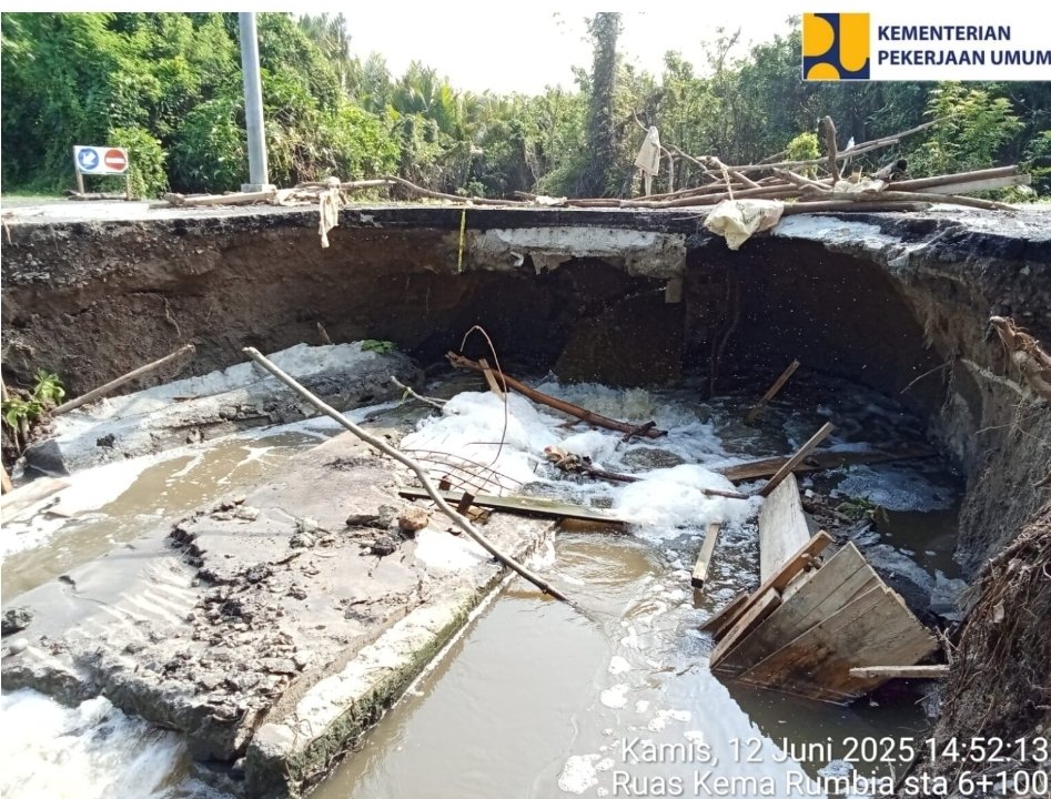 “Pada Ruas Jalan Kema – Rumbia Km 7 ini terdapat Cross Drain yang sebelumnya rusak karena abrasi laut. Upaya yang sudah kami lakukan adalah proteksi sementara serta perencanaan dan penganggaran untuk membangun kembali secara permanen,” jelas Ringgo.