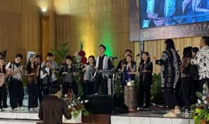 Penampilan paduan suara Unklab turut memeriahkan acara, membuat Fathan tersenyum dan memberikan tepuk tangan sebagai bentuk apresiasi.