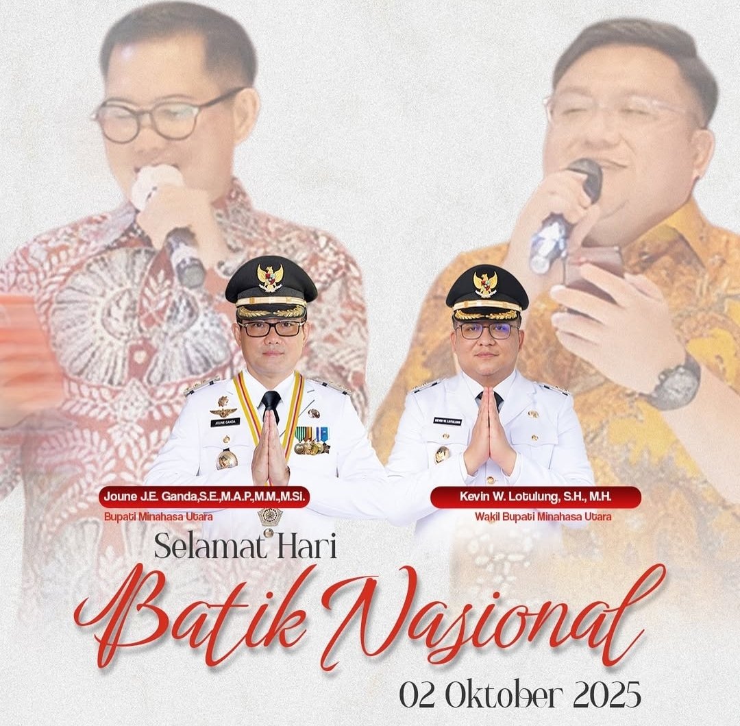 MINUT KOMENTAR-Dalam semangat memperingati Hari Batik Nasional yang jatuh setiap tanggal 2 Oktober, Bupati Minahasa Utara, Joune Ganda, SE. MAP. MM. M.Si, menyampaikan pesan penuh makna melalui akun TikTok pribadinya, Jumat, (02/09/2025). Lewat sebuah flyer yang menampilkan dirinya bersama Wakil Bupati Kevin Lotulung, SH,. MH, Bupati Joune mengajak seluruh masyarakat untuk mengenakan batik sebagai bentuk cinta terhadap warisan budaya Indonesia.
