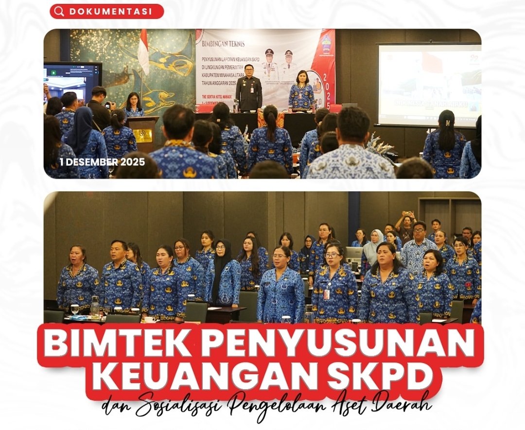 MINAHASA UTARA KOMENTAR-Bupati Minahasa Utara, Bapak Joune Ganda, secara resmi membuka Bimbingan Teknis (BIMTEK) Penyusunan Keuangan SKPD serta Sosialisasi Pedoman Pengelolaan Barang Milik Daerah, yang digelar di The Sentra Hotel Minahasa Utara, Senin (01/12/2025).