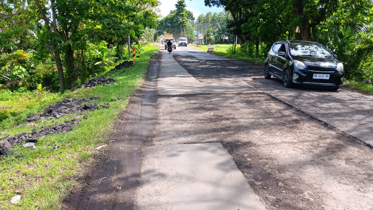 Kondisi jalan yang rusak parah di Desa Ambang, Kecamatan Inobonto, Kabupaten Bolaang Mongondow, sepanjang 3–4 km, memperlihatkan hasil pekerjaan yang asal-asalan dan membahayakan pengguna jalan.