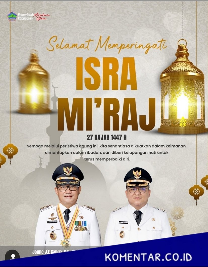 MINUT KOMENTAR-Bupati minahasa Utara Joune Ganda, SE. MAP. MM. M.Si, didampingi Wakil Bupati Kevin Lotulung. SH. MH, menyampaikan ucapan selamat memperingati Isra Mi’raj Nabi Muhammad SAW 1447 H / 2026 M kepada seluruh umat Muslim di Minahasa Utara dan sekitarnya.