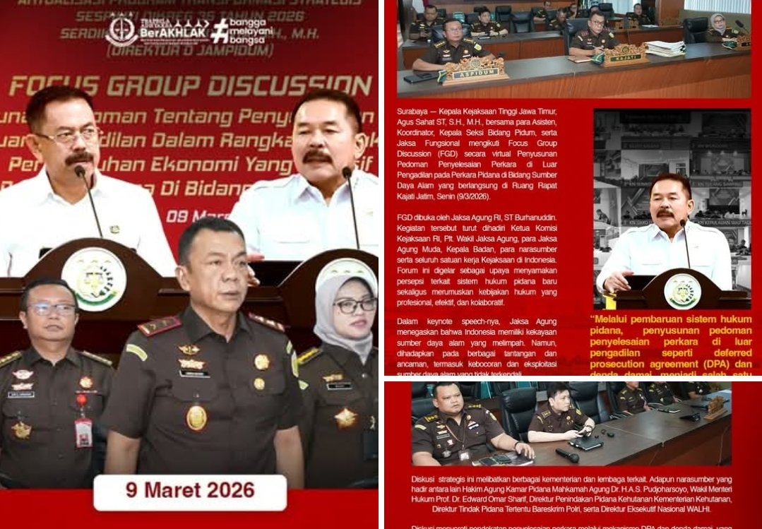 Hari Senin, 9 Maret 2026, Kepala Kejaksaan Tinggi Jawa Timur Agus Sahat ST, S.H., M.H., bersama jajaran mengikuti Focus Group Discussion (FGD) virtual yang digelar dari Ruang Rapat Kajati Jatim. Forum ini dibuka langsung oleh Jaksa Agung RI ST Burhanuddin, dengan kehadiran Ketua Komisi Kejaksaan RI, Plt. Wakil Jaksa Agung, para Jaksa Agung Muda, Kepala Badan, serta narasumber lintas kementerian, lembaga, dan organisasi masyarakat sipil.