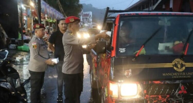 SITARO KOMENTAR-Personel Polres Kepulauan Siau Tagulandang Biaro (Sitaro) berbagi takjil di sepanjang